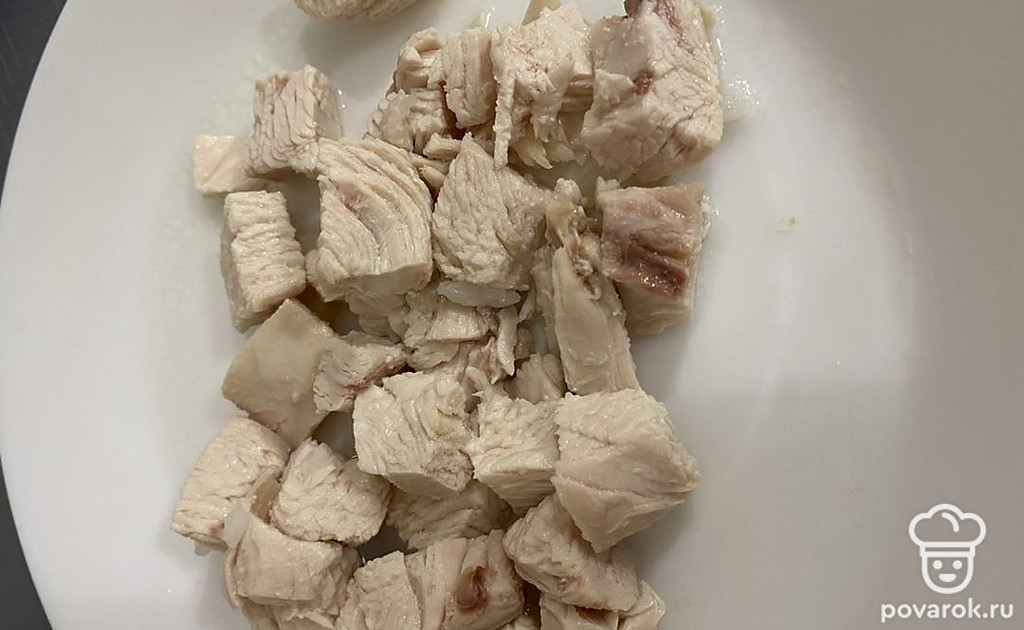 Освободить мясо от костей, нарезать на кубики, добавить в бульон, выключить огонь.