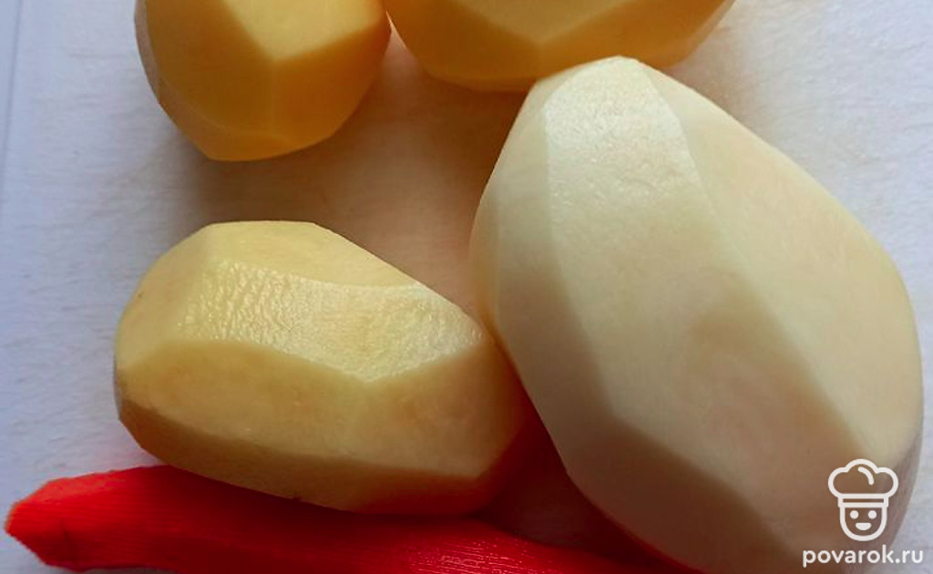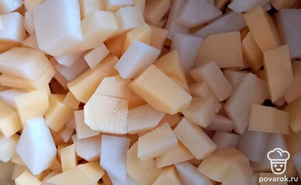 Картофель порезать кубиками, промыть, выложить в кастрюлю для супа и залить готовым бульоном. Поставить на медленный огонь.