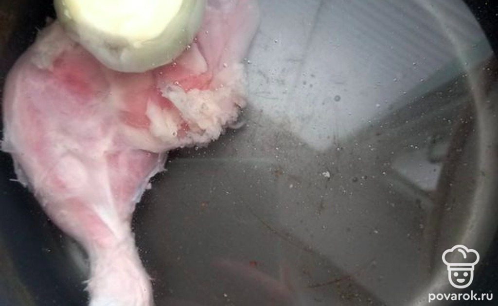 Лук почистить, положить к окорочку и варить на медленном огне 1 час.