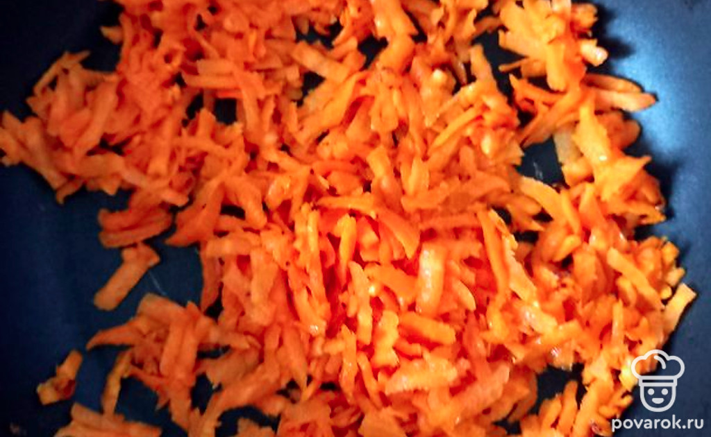 Морковь натереть на тёрке и обжарить на сковороде до золотистого цвета.
