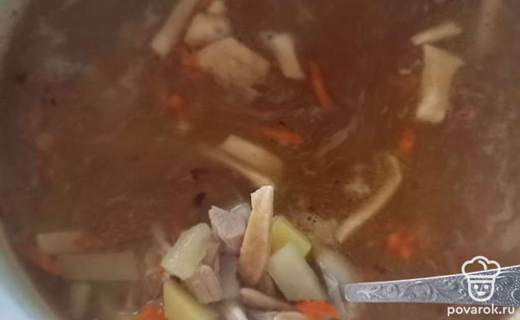 Бульон посолить, выложить в кастрюлю морковь, курицу и томить на медленном огне 10 минут.