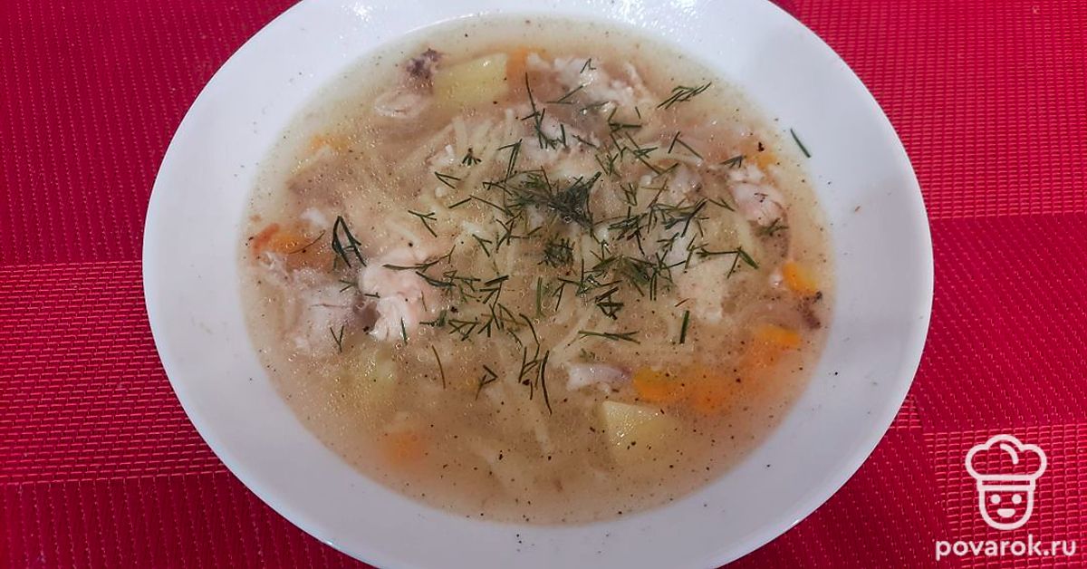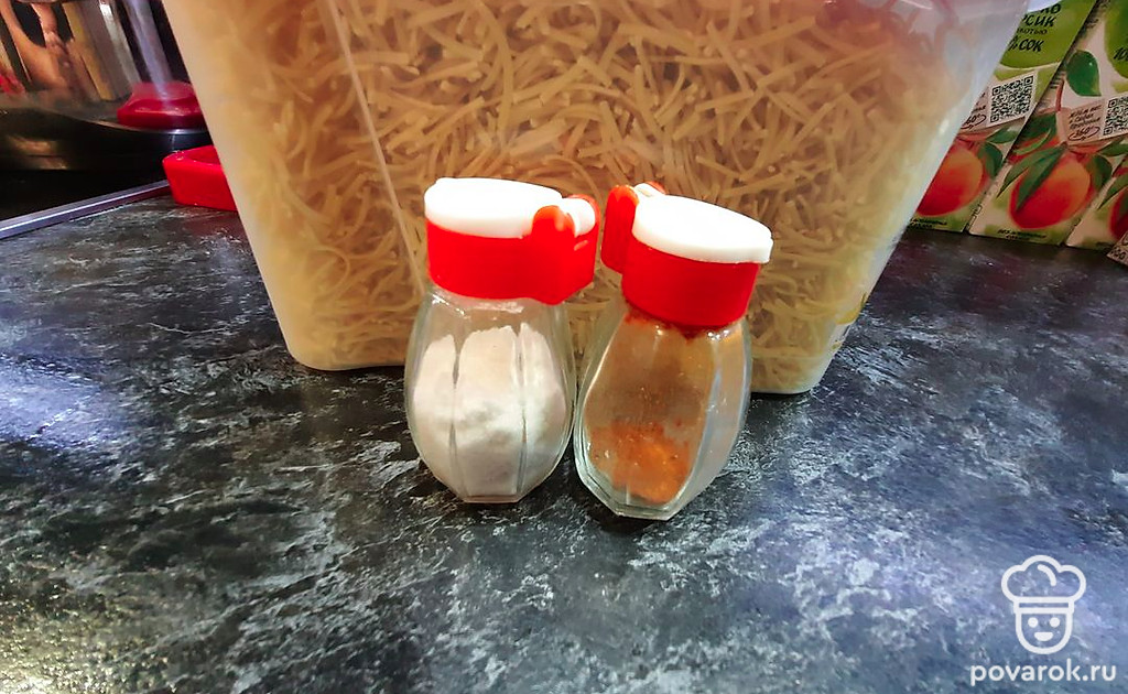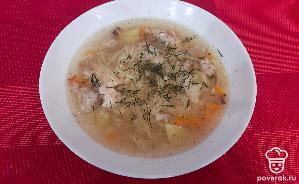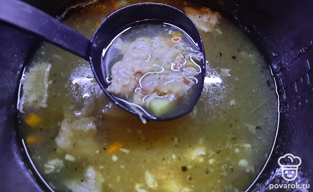 Добавляем в бульон полстакана вермишели, соль и перец по вкусу.