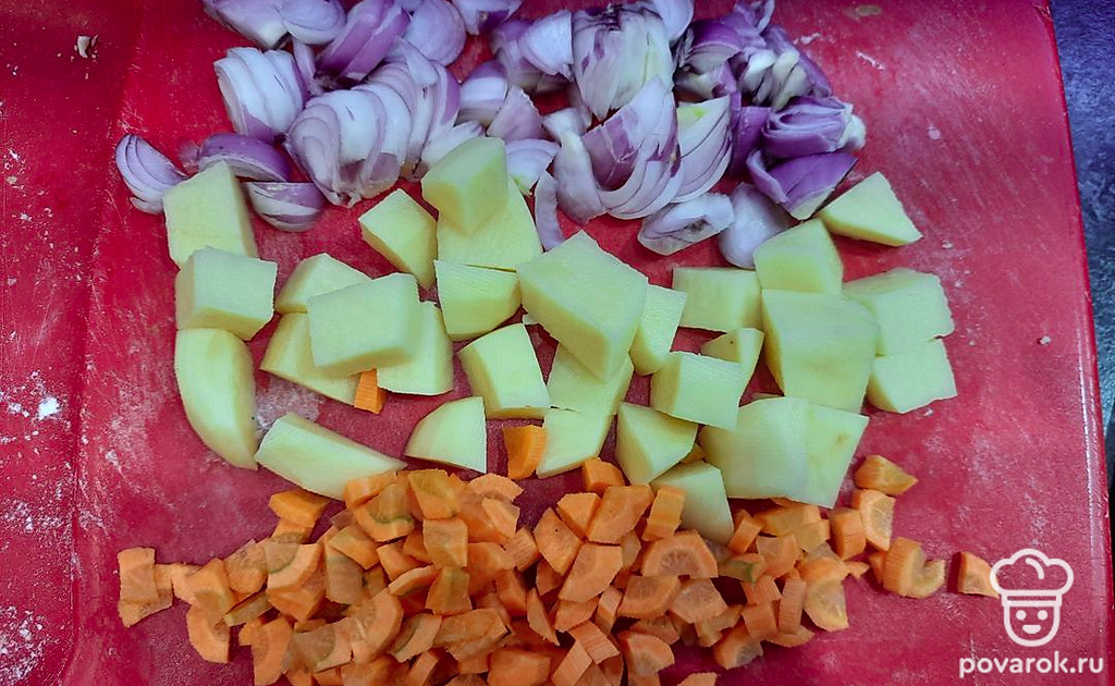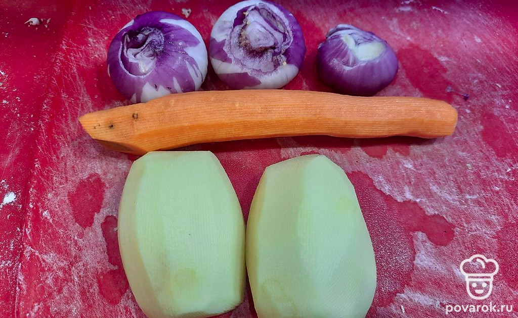 Очищаем овощи: картофель, морковь и репчатый лук.