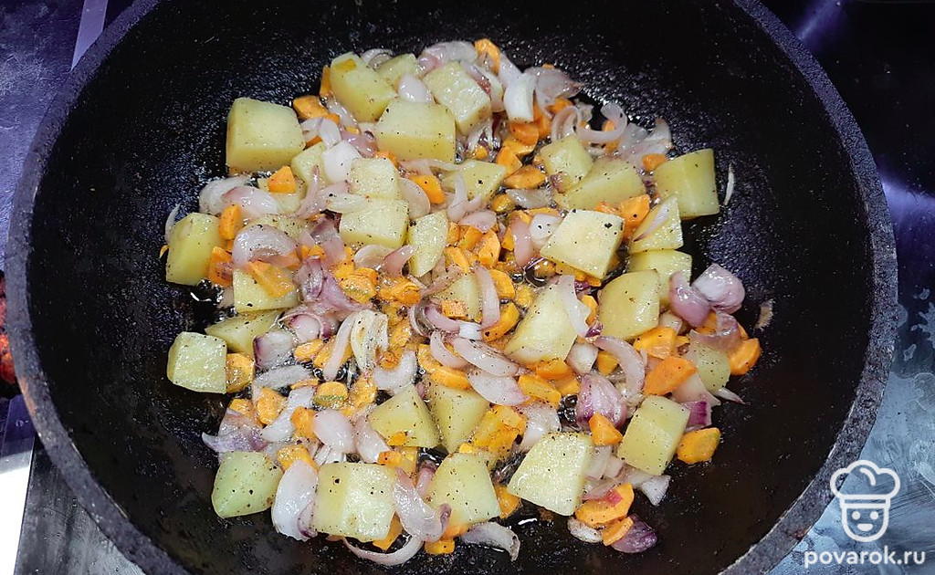 Обжариваем овощи на сковороде с добавлением растительного масла 5-7 минут. Добавляем овощную зажарку в бульон.