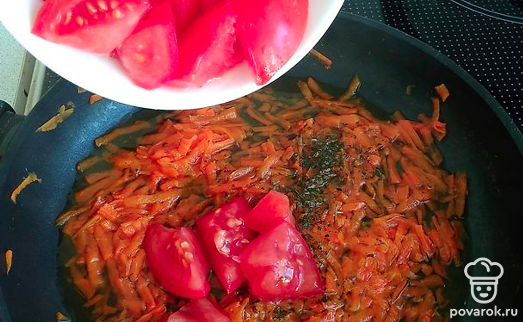 Через 20 минут добавьте резаные помидоры без кожуры.