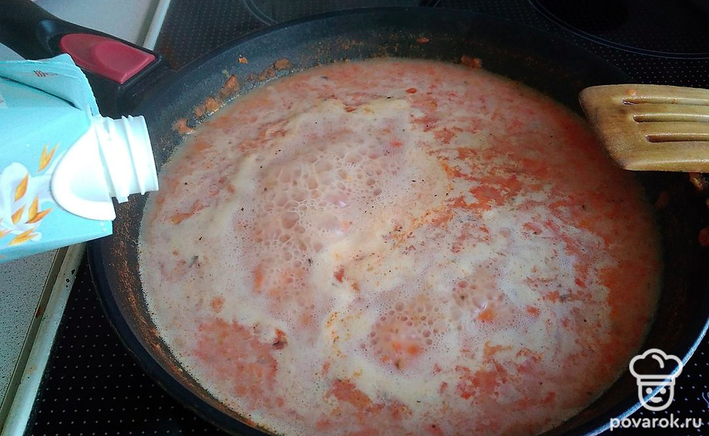Продолжайте тушить на медленном огне. Через 7 минут влейте овсяное молоко. Хорошо перемешайте.