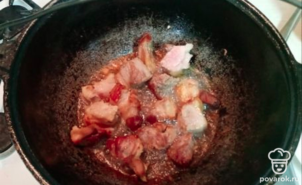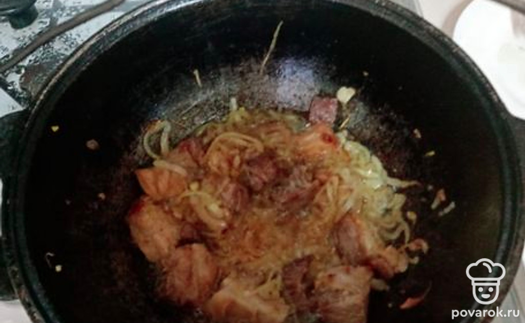 Положите мясо и жарьте 20 минут на сильном огне без крышки до золотистого цвета, а потом ещё 10 минут тушите под крышкой.
