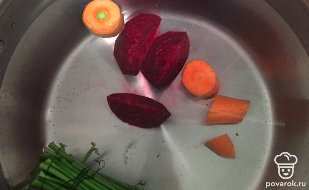 В кастрюлю наливаем воду и кладём туда 1 морковь, одну свеклу, порезанную на 4 части, и зелень. Варим овощной бульон.
