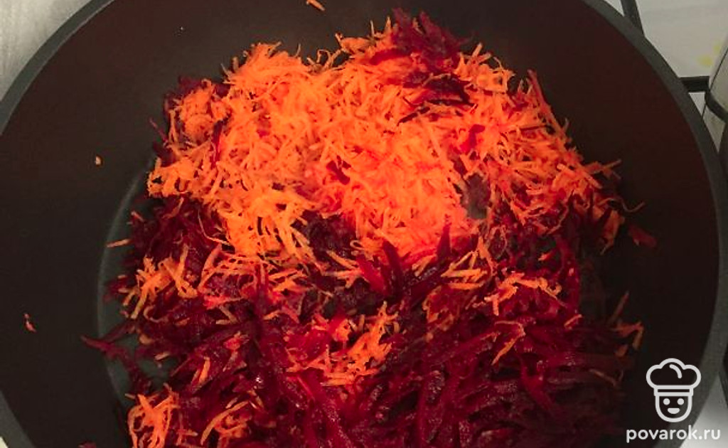 Натираем свеклу и морковь, обжариваем на сковороде.