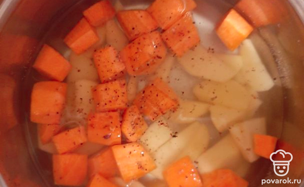 Почистите овощи, крупно нарежьте. Сначала бросьте морковь (пусть прогреется), потом картошку, залейте водой или бульоном, чтобы немного покрывало овощи. Доведите до кипения.
