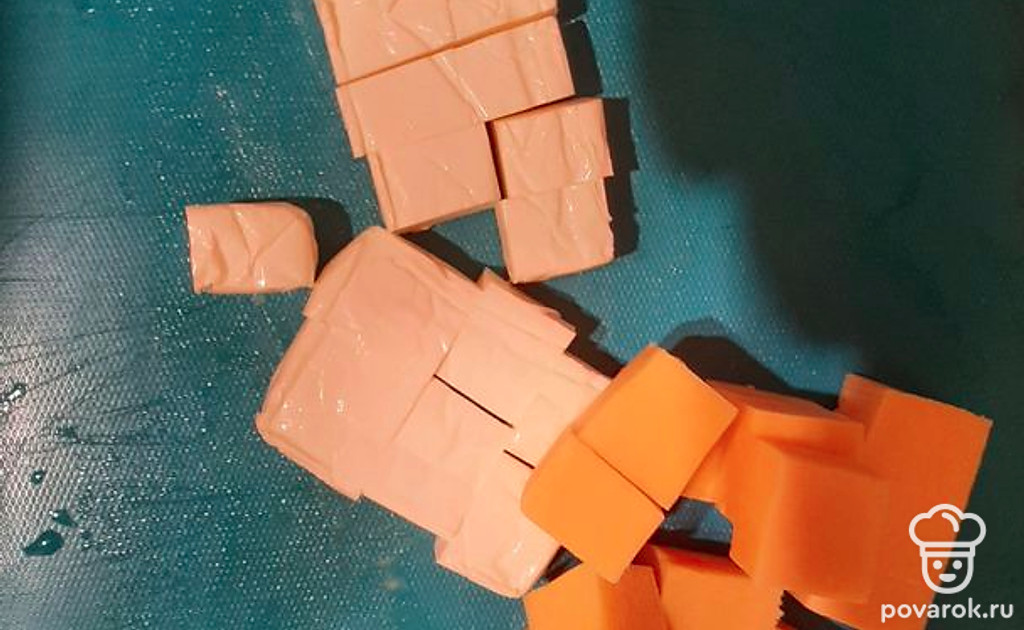 Нарежьте сыр чедер (он лучше всех тянется) и дружбу кубиками. Сначала добавьте к овощам твёрдый сыр, потом мягкий. Когда закипит, можно добавить сливки, но учитывайте, что они замедляет процесс варки.