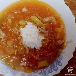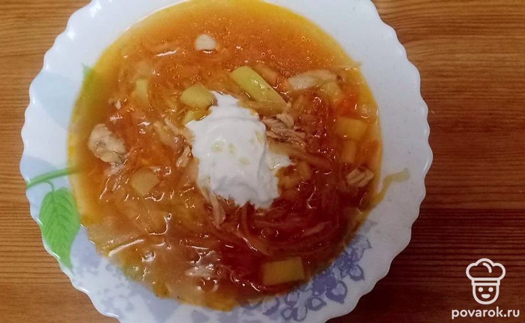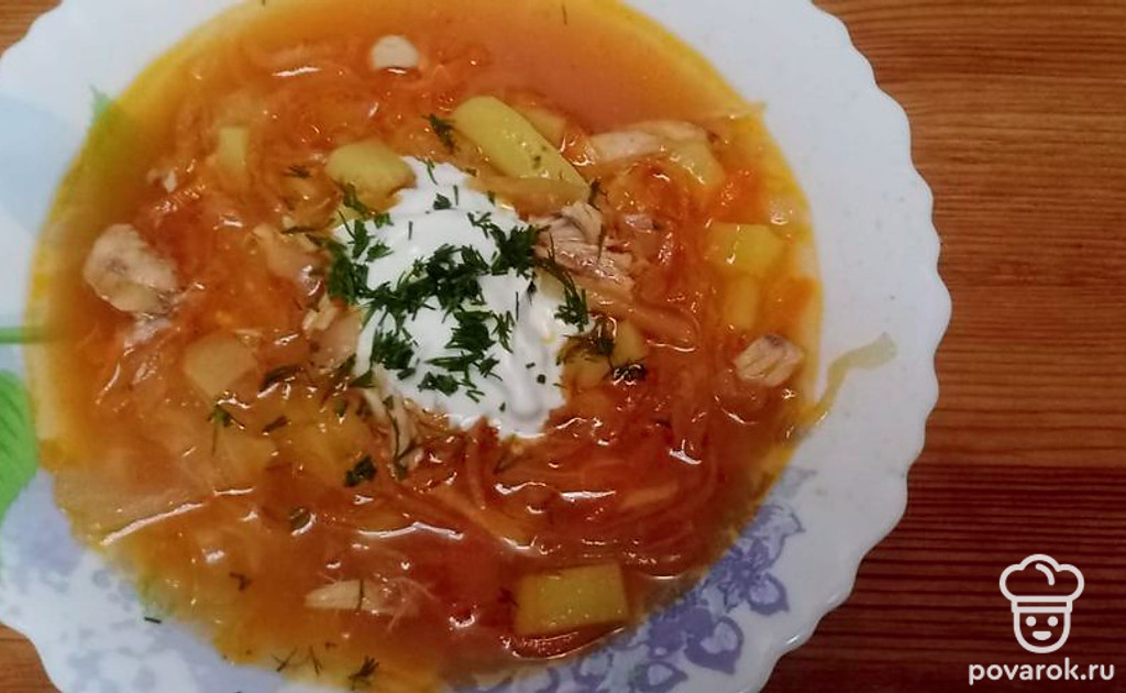 Борщ с квашеной капустой подаём порционно, со сметаной и укропом. Приятного аппетита.
