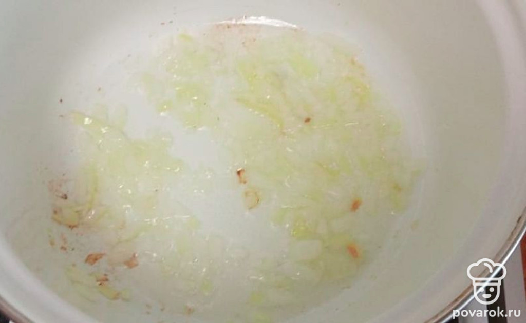 Лук мелко нарезаем и обжариваем до золотистого цвета.