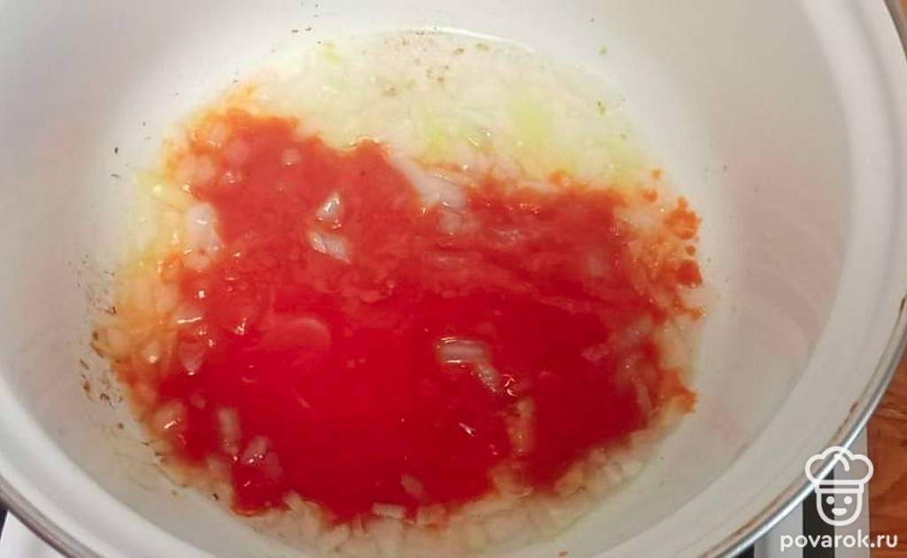 Добавляем томатную пасту, прожариваем 2-3 минуты.