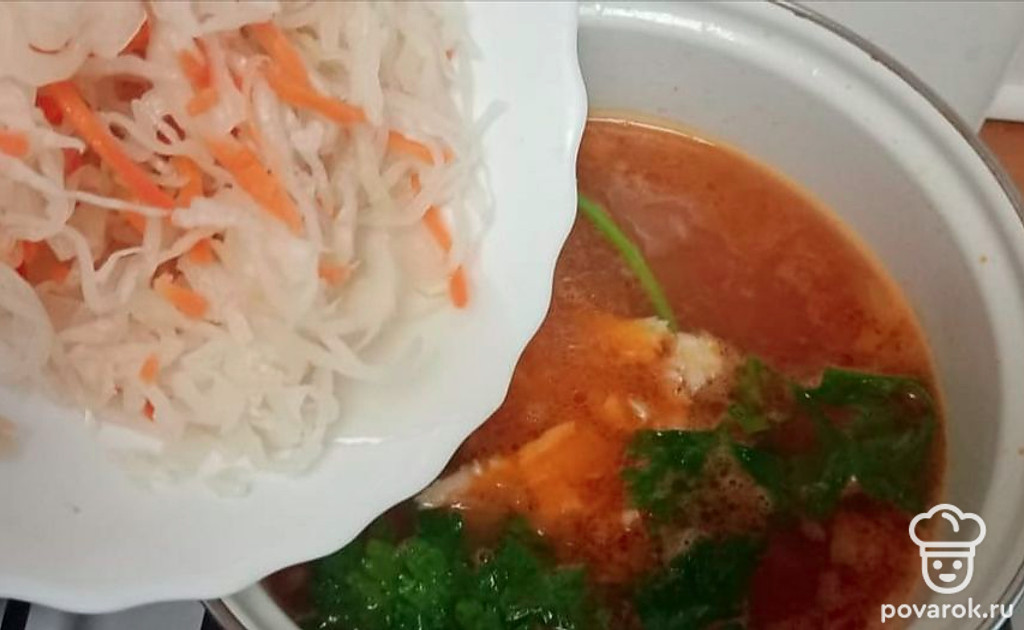 Когда бульон закипит, добавляем квашеную капусту, отвариваем 5-7 минут.