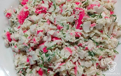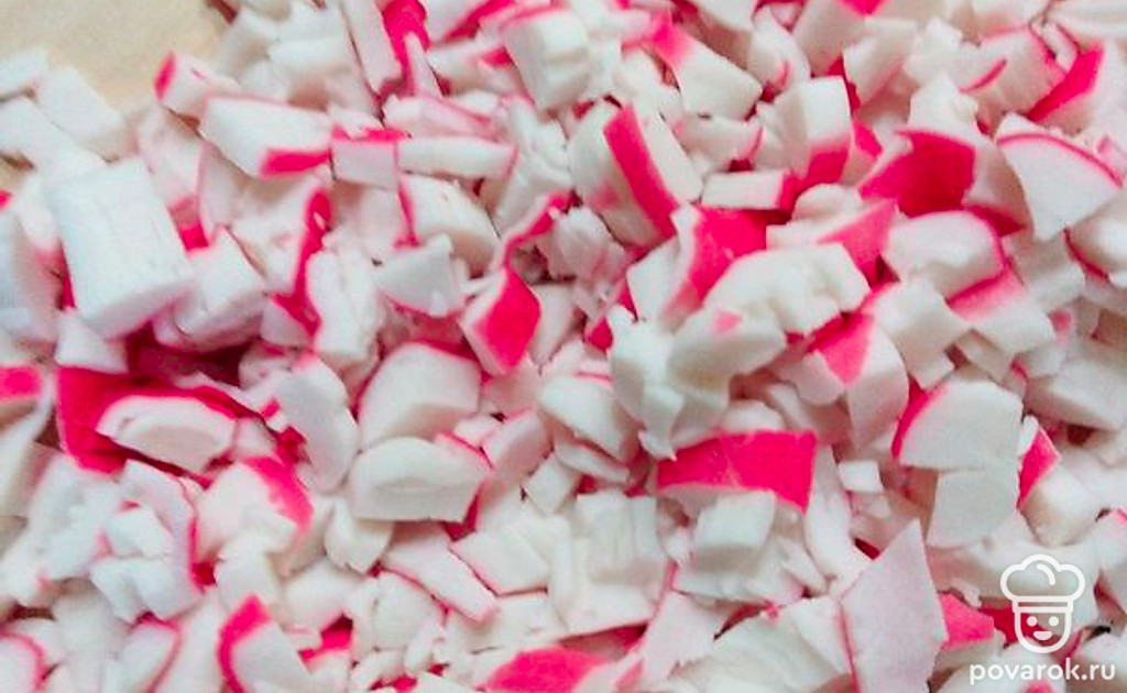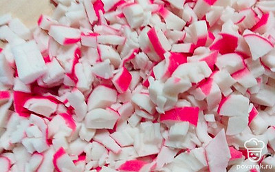 Мелко нарежьте крабовые палочки.