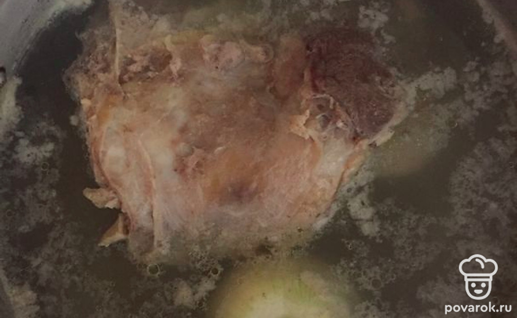 Залить в кастрюлю воду, положить целую луковицу и говядину. Варить до полной готовности лука, постепенно убирая пенку.