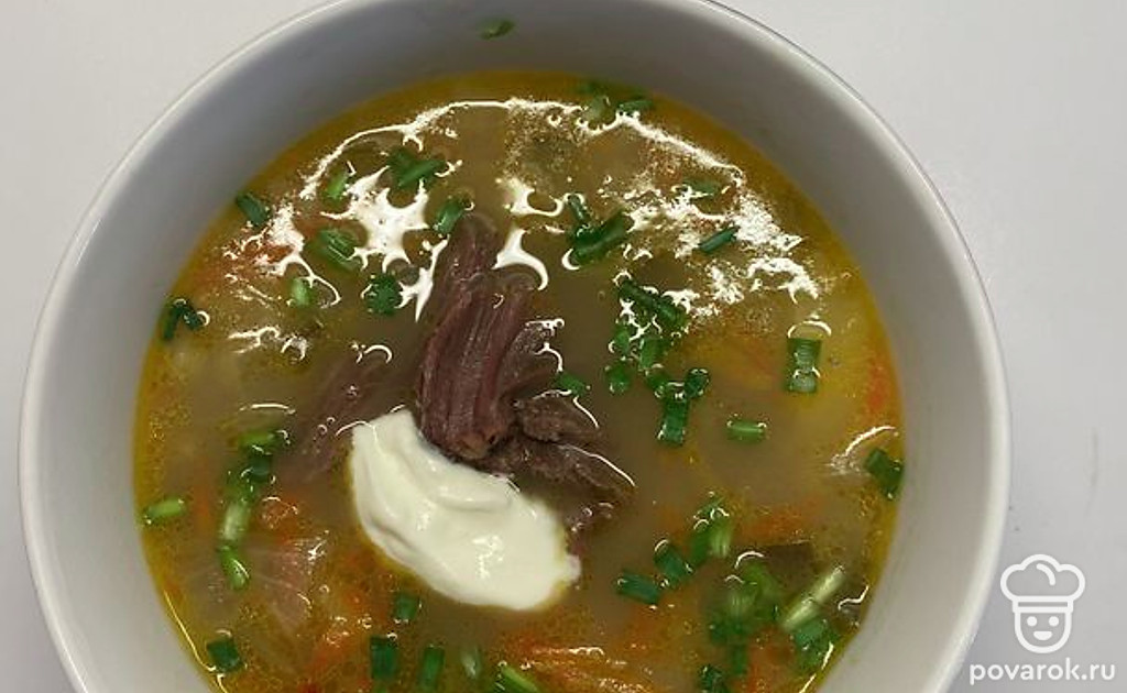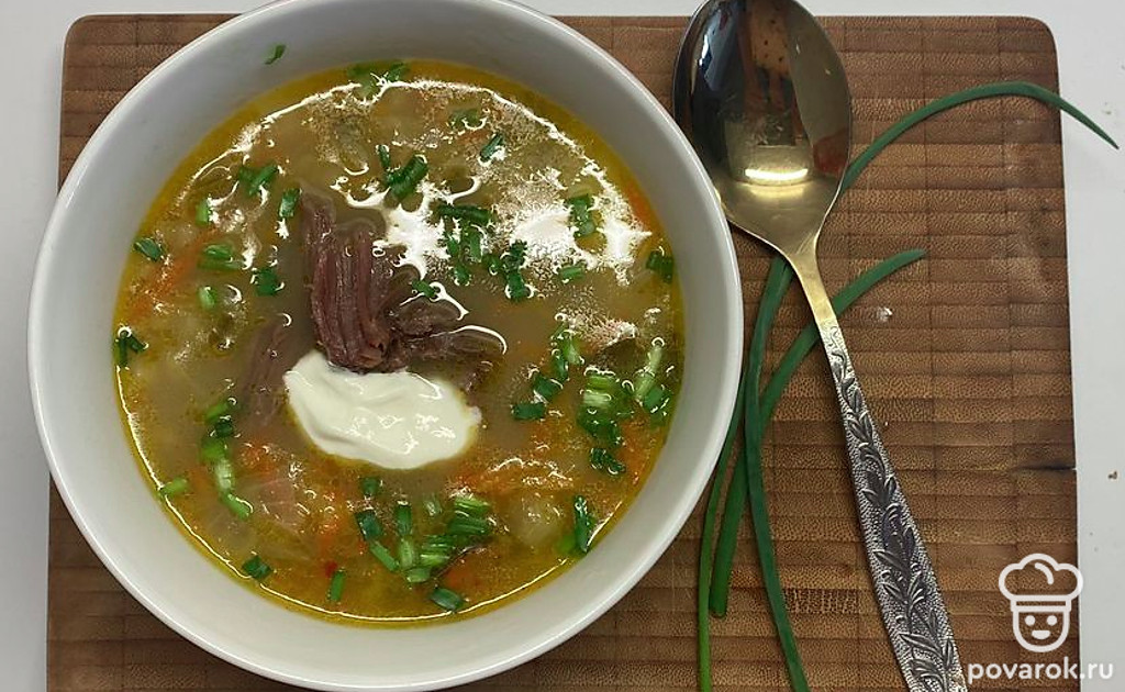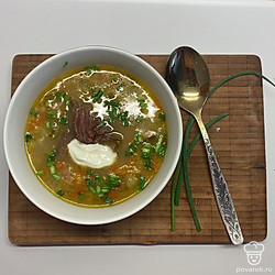 Подавать к столу со сметаной и зеленью. Получился густой ароматный суп с кислинкой.