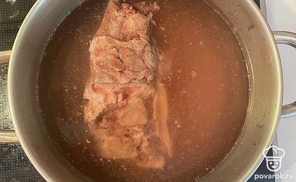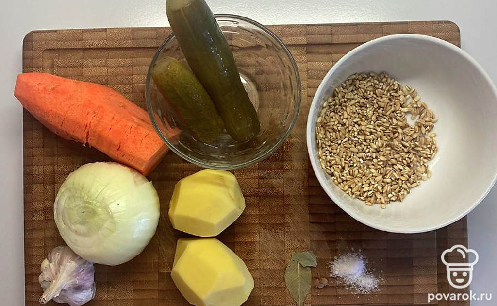 Поставьте на медленный огонь говяжью кость, промойте перловку и оставьте в холодной воде. На час или пока мясо не будет отходить от кости. Почистите овощи.