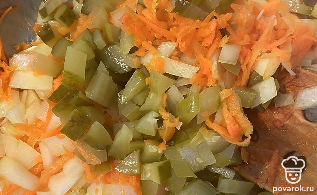 Натрите на терке морковь или нарежьте полосками. Порежьте лук и маринованы огурцы.