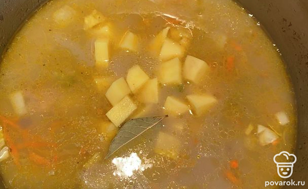 Из бульона достать кость и процедить. Добавить перловку варить 15 минут на медленном огне.