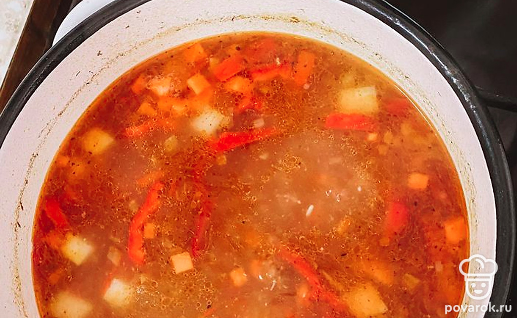 Мясо должно вариться примерно 20-25 минут. Зажарку отправляем в кастрюлю и оставляем на 5 минут.