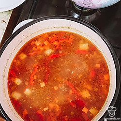 Мясо кладем в кастрюлю с водой и оставляем до закипания. Овощи нарезаем и обжариваем на небольшом количестве растительного масла.