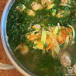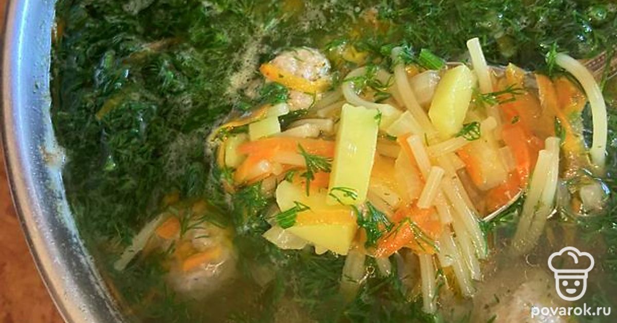Соединяем пережарен и зелень с супом. Добавляем лавровый лист и варим до готовности вермишели.