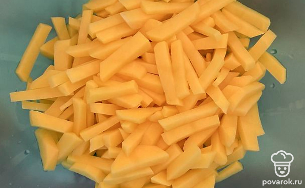 В кипящую подсоленную воду добавляем картофель нарезанный соломкой.