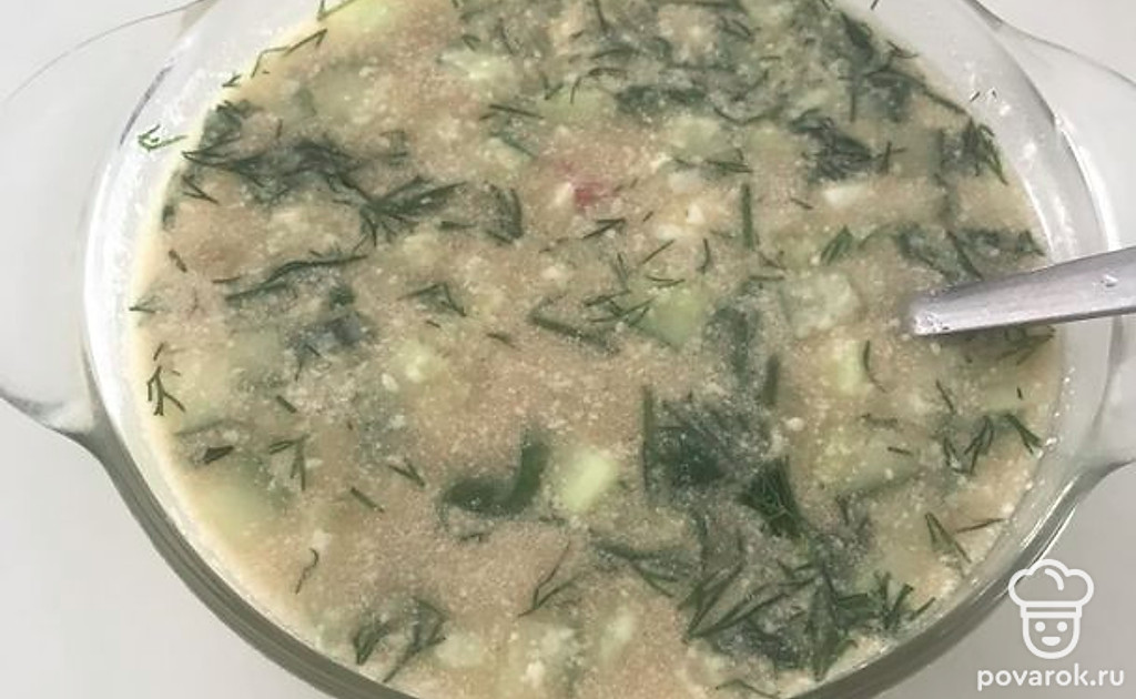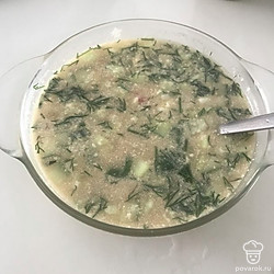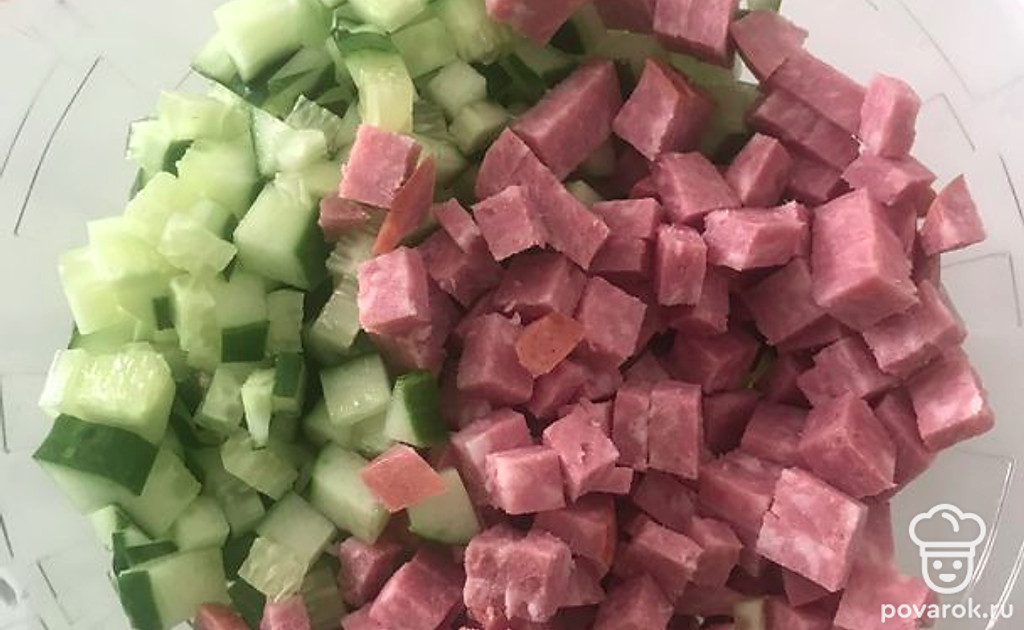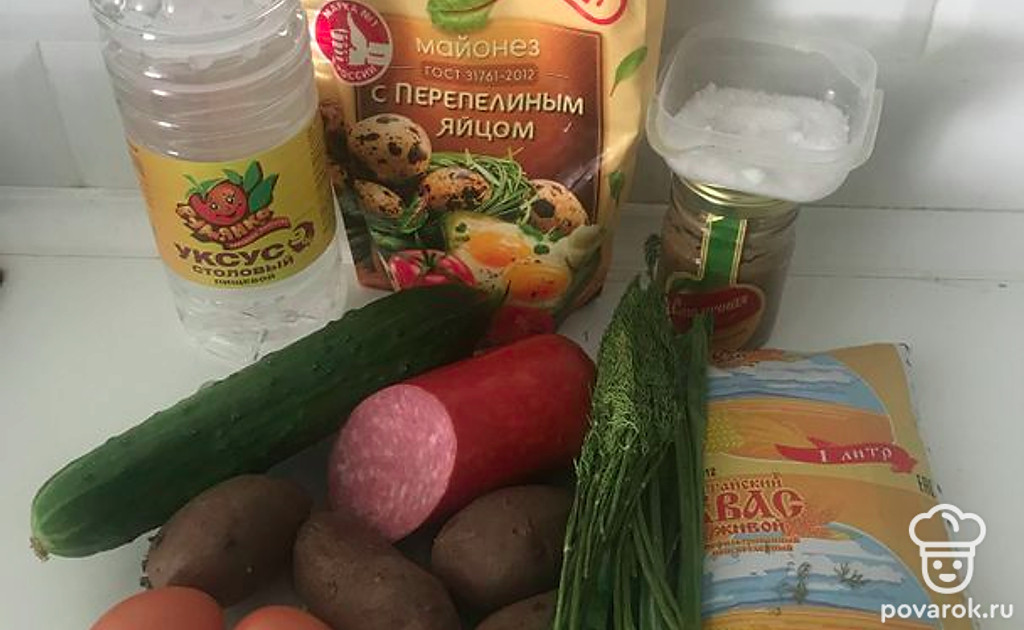 Окрошку делаю всегда с копченой колбасой, яйцами и картошкой.