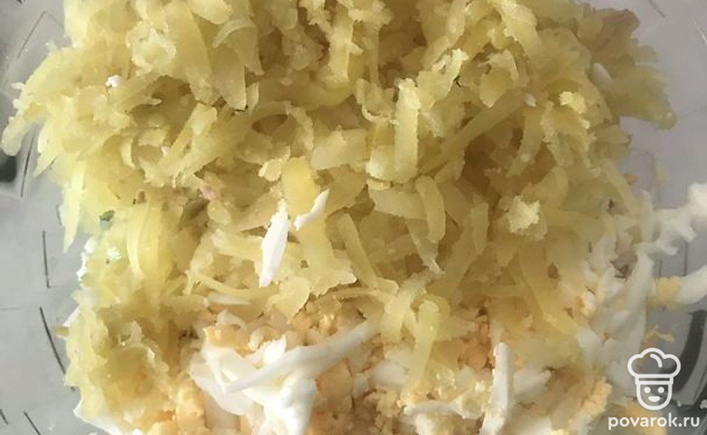 Картошку и яйца отварить и остудить,натереть на крупной тёрке.