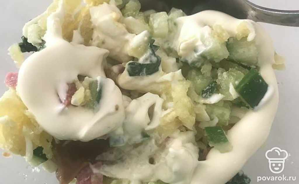 Все перемешать, добавить зелень и заправить майонезом, по желанию можно добавить горчицу и уксус 9% по 1/2 чайной ложки.