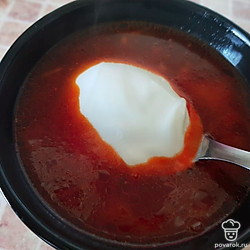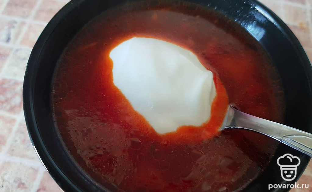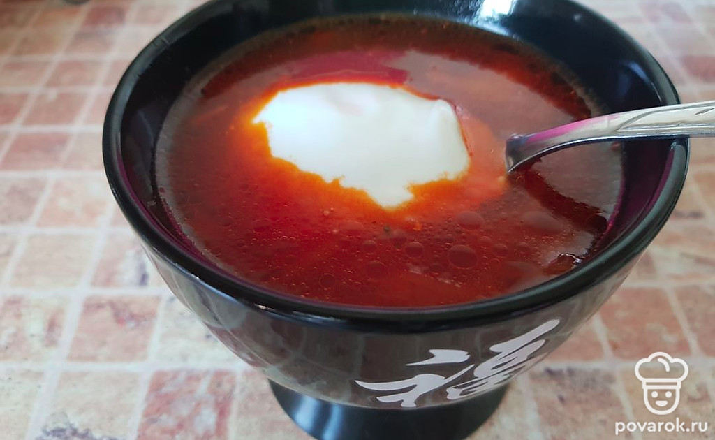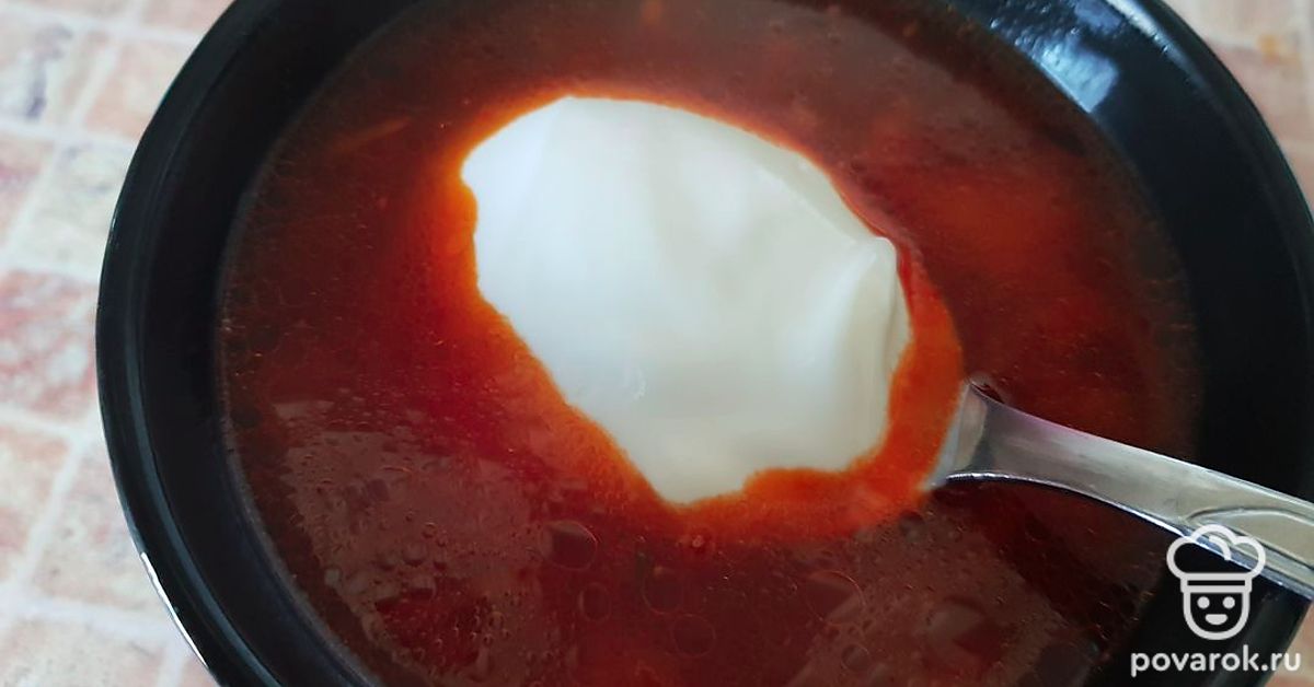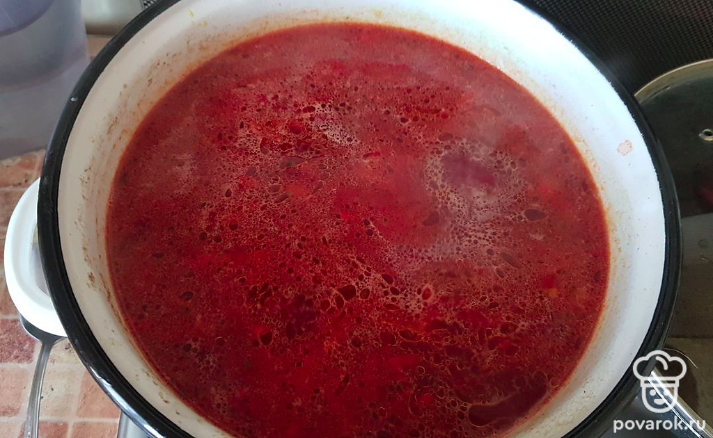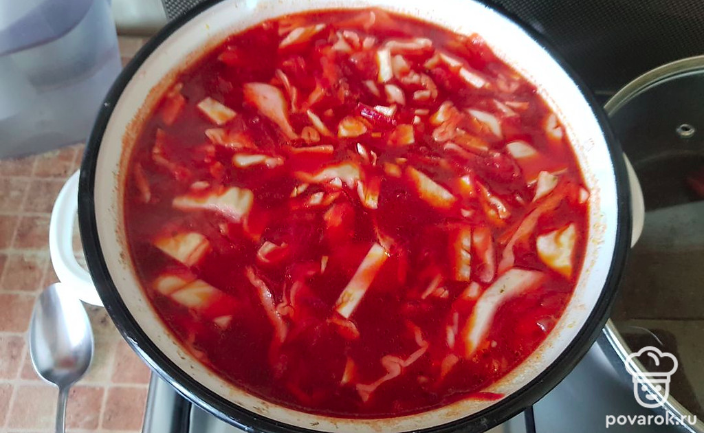 Свёклу отправляем в кастрюлю и добавляем уксус. Солим, если бульон был не солёный и варим на слабом огне под крышкой 10 минут.