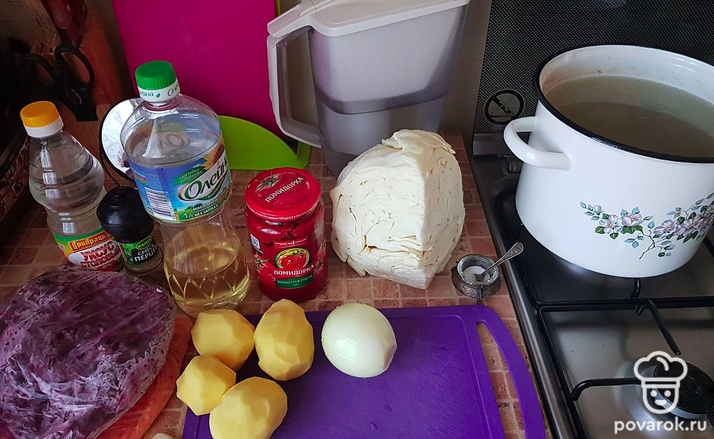 И отправляем её в кастрюлю. Всё перемешиваем и варим ещё минут 15-20 до готовности капусты. За 5 минут до готовности можно добавить лавровый лист.