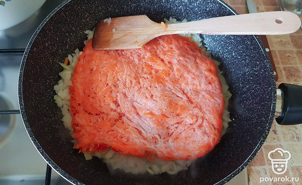 Потом добавляем тёртую морковь. На этом этапе можно посолить и поперчить зажарку, а также добавить любые приправы на ваш вкус.