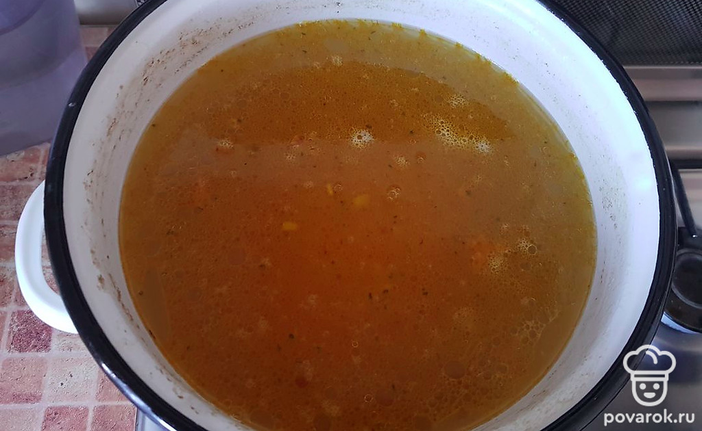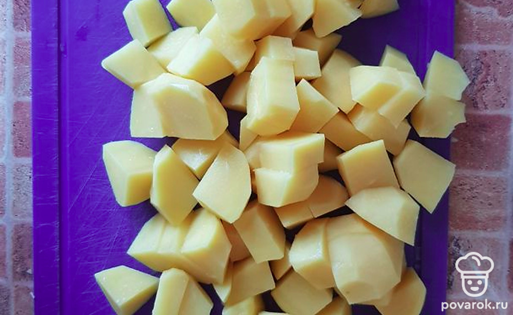 Картофель режем средним кубиком и отправляем в кипящую бульон. Варим 10 минут.