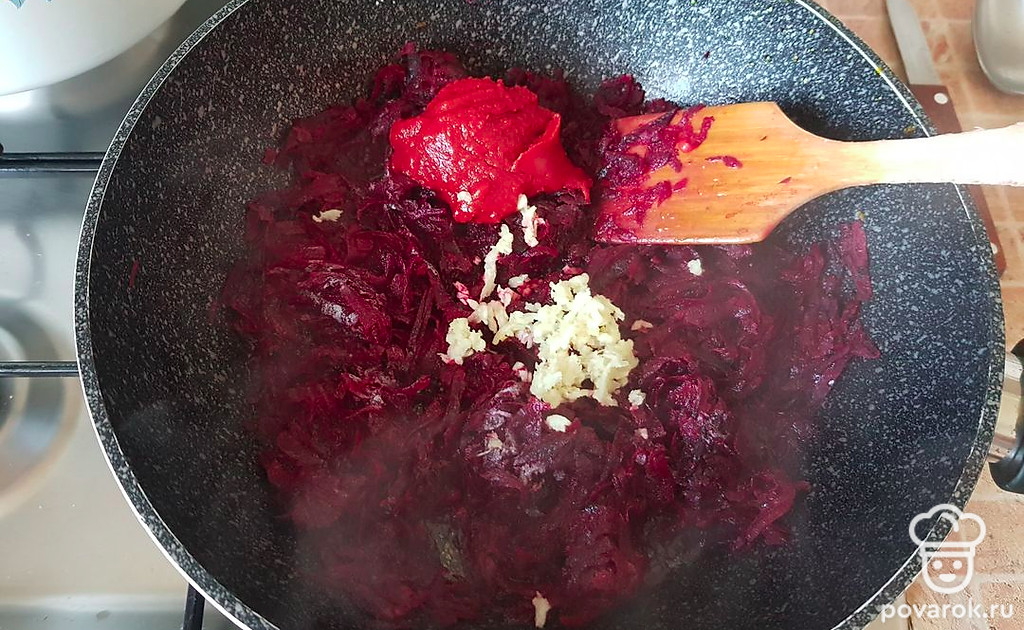 В той же сковороде обжариваем на масле свёклу с томатной пастой и чесноком. 5-7 минут.