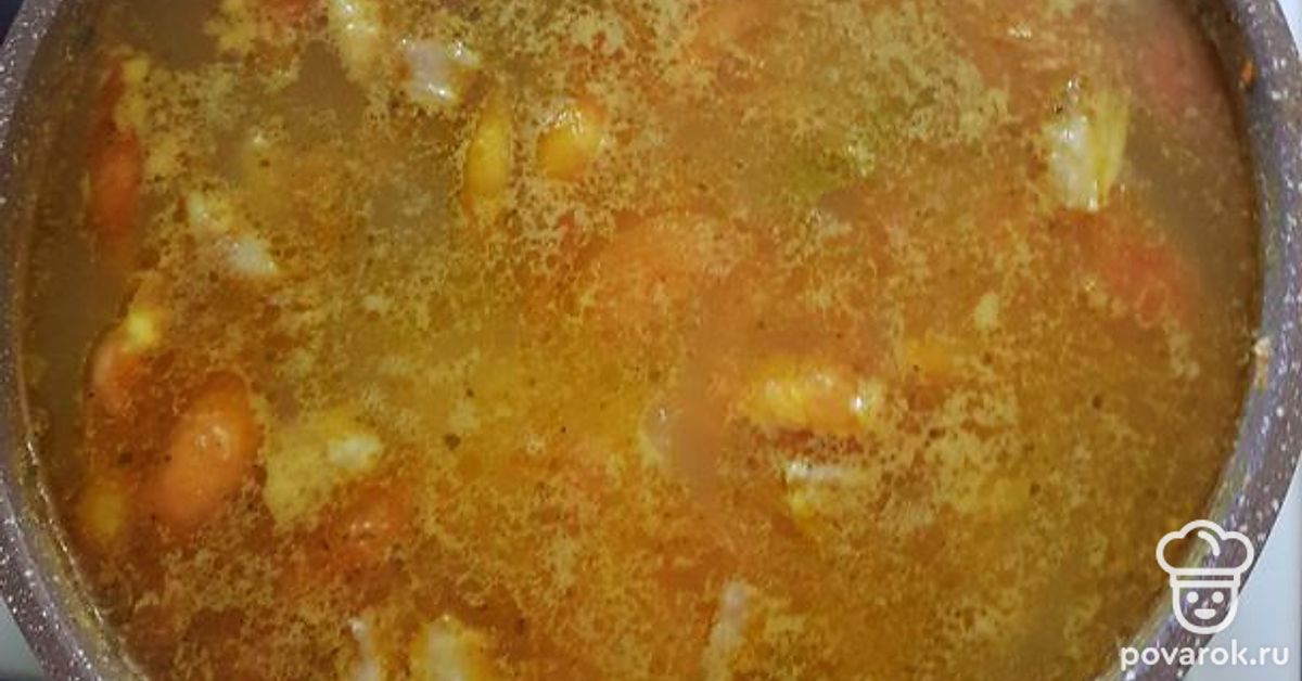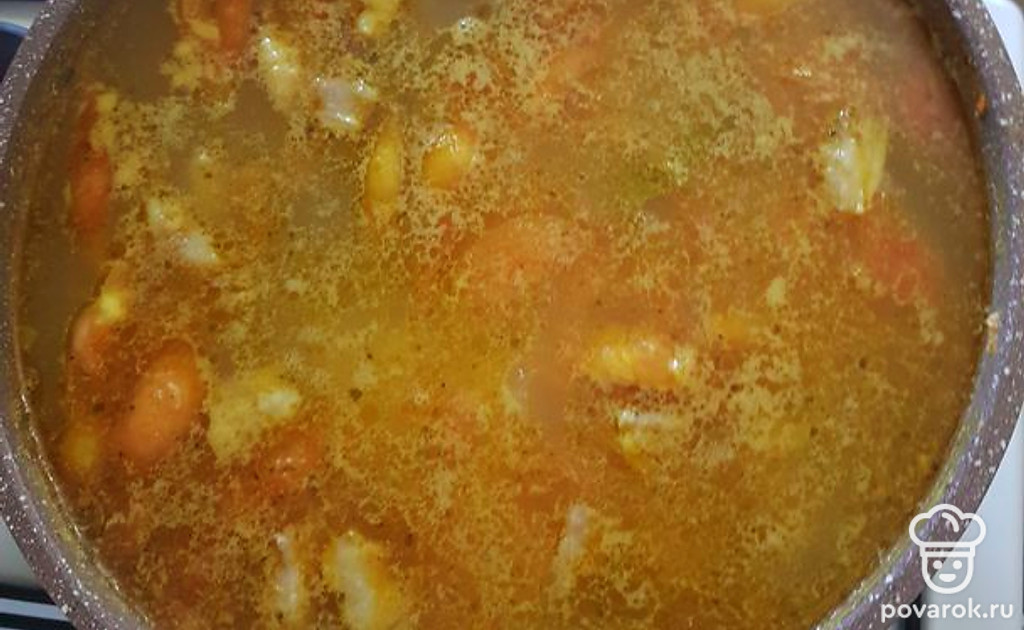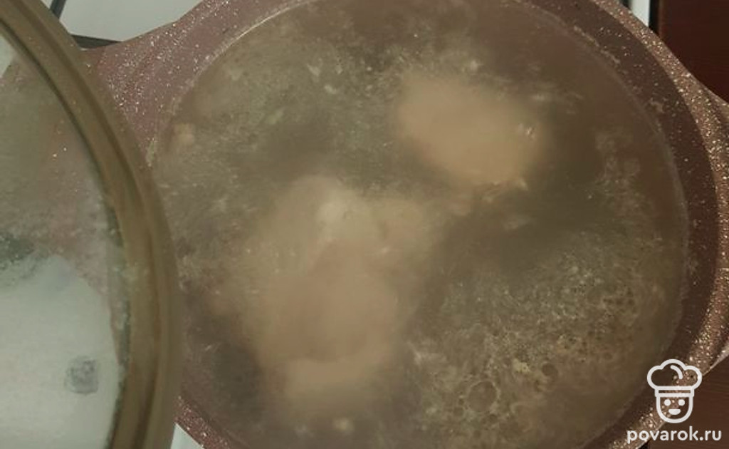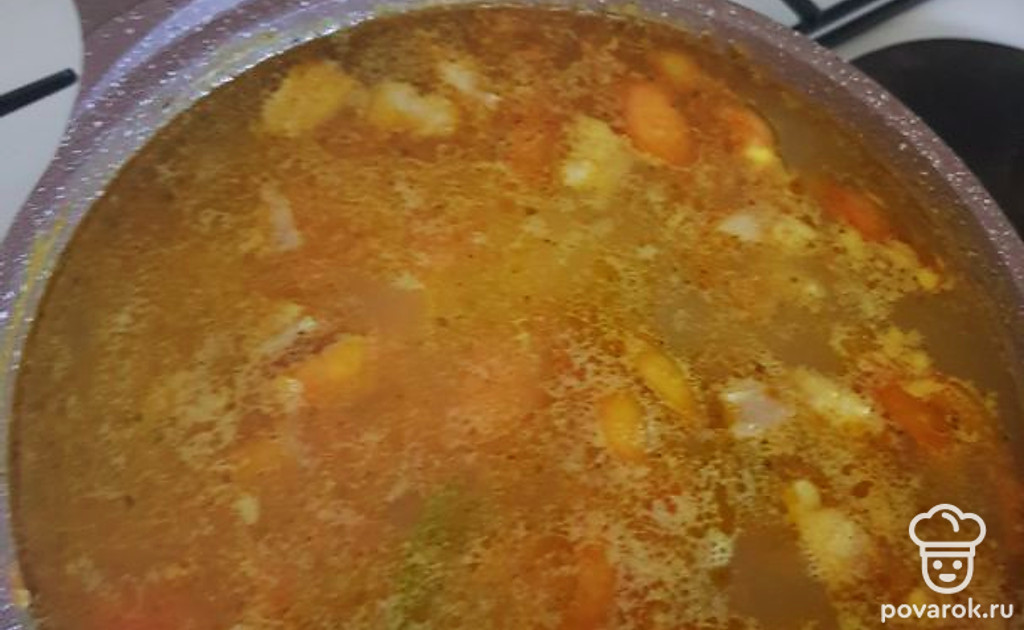 Достать и нарезать свинину. Картошку и пережарку отправить в кастрюлю, по вкусу можно положить смесь перцев. Нарезанное мясо закинуть в суп. Варить до готовности.