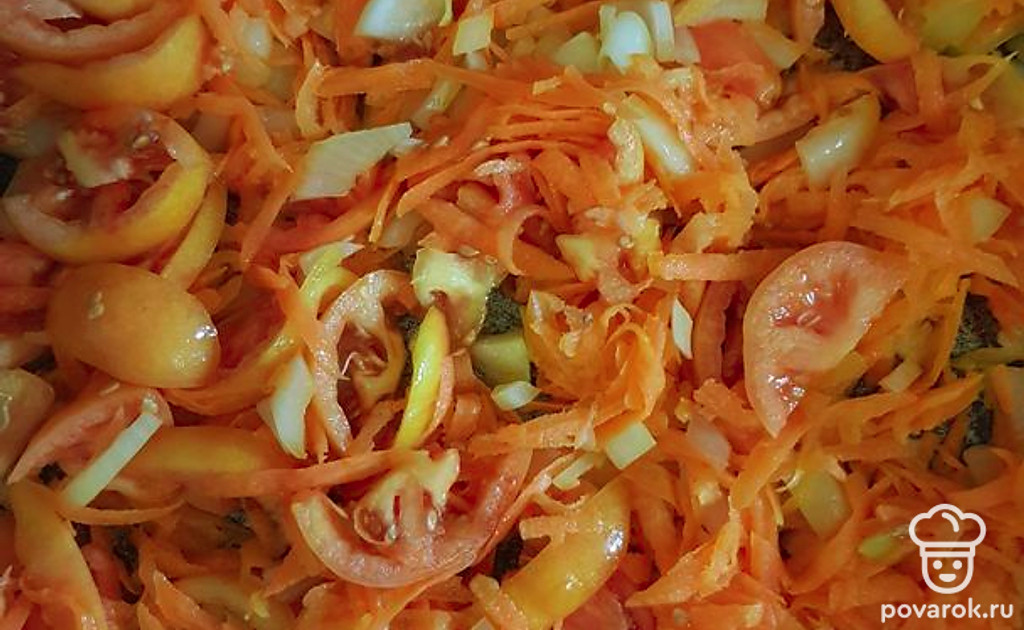 Пережарить помидоры, лук и морковь. Рис закинуть вариться к свинине. При варке помешивать.