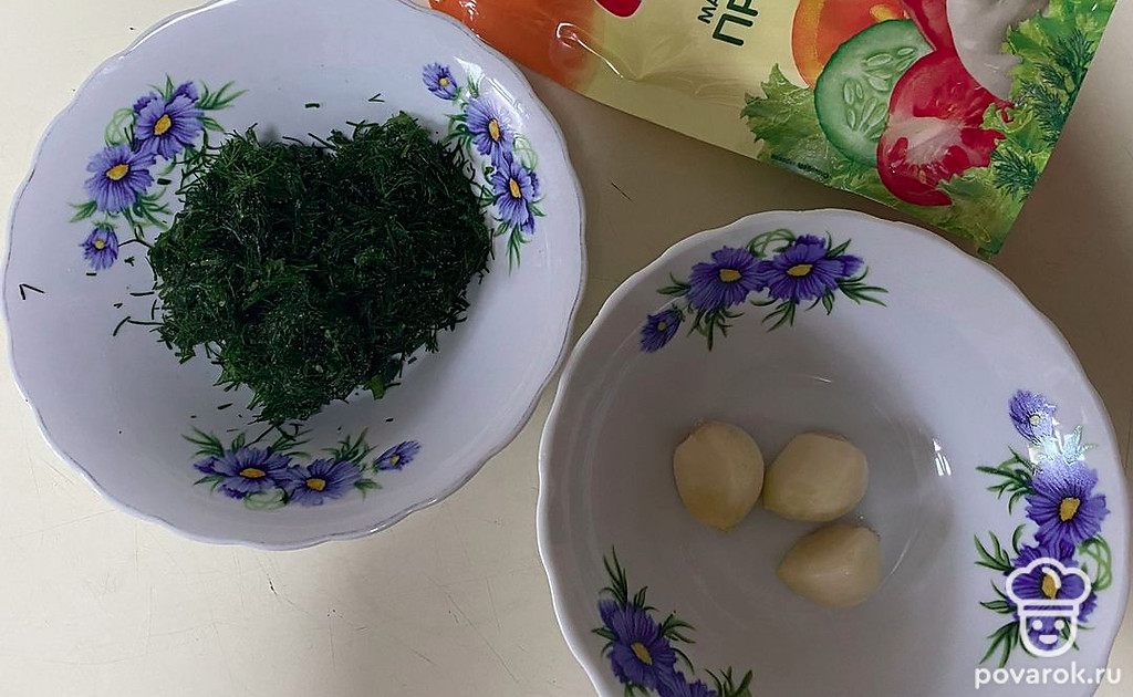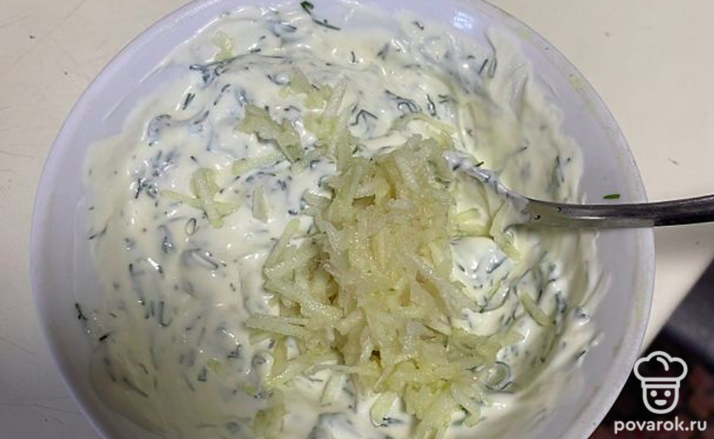 Приготовьте соус. Натрите чеснок на терке, мелко нарежьте укроп. Смешайте с майонезом.