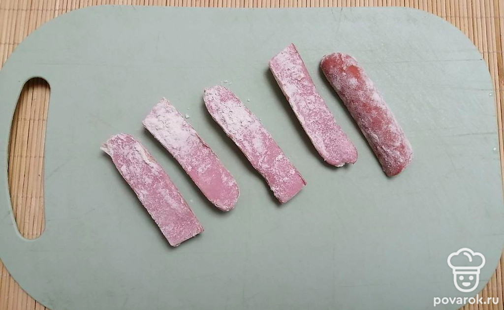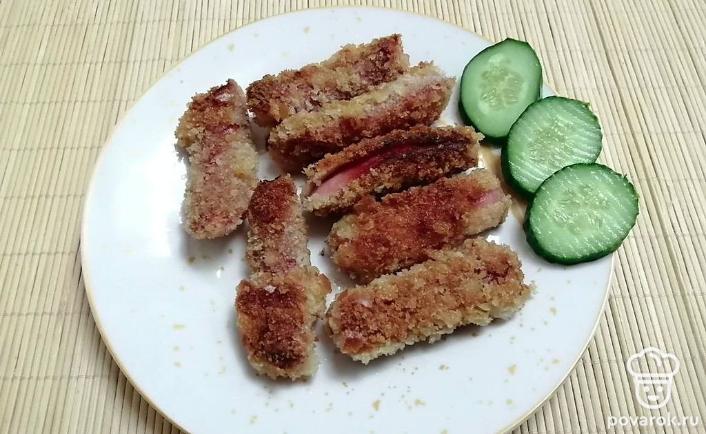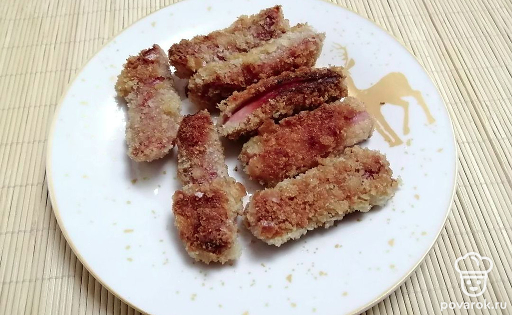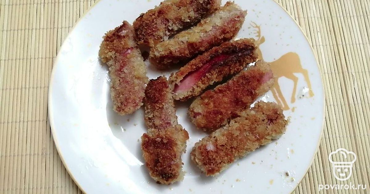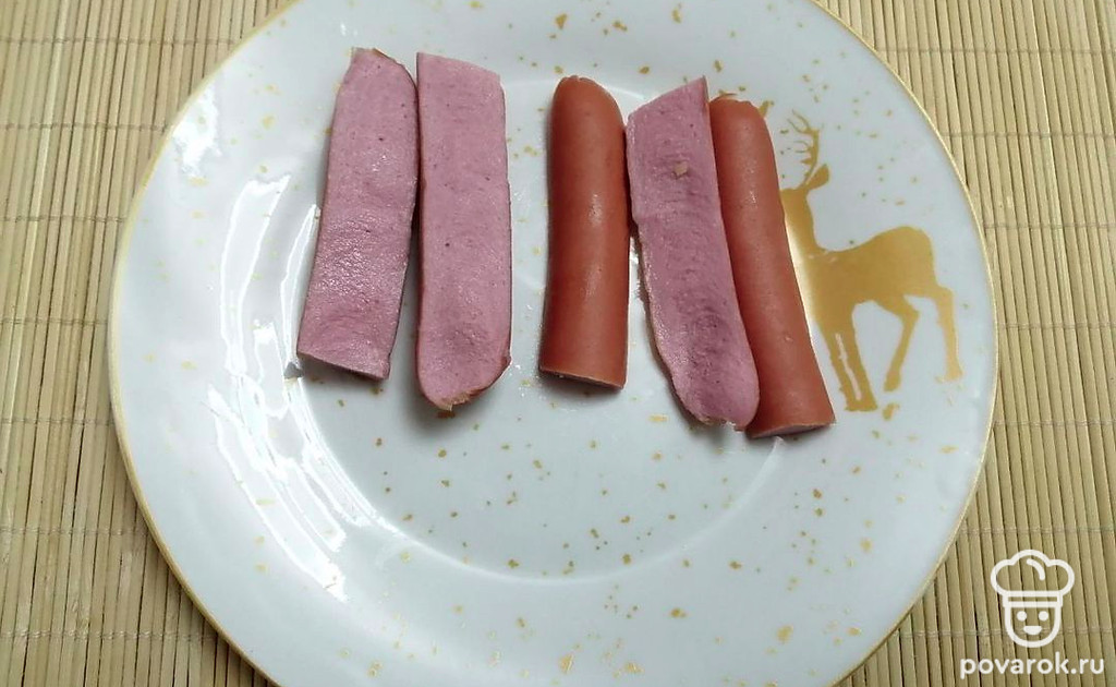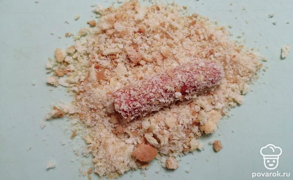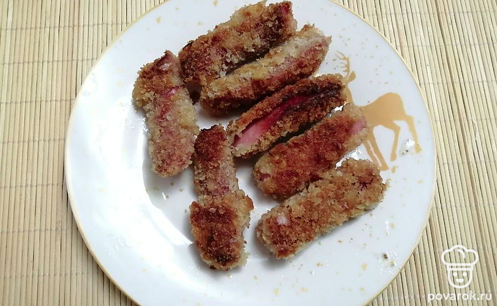 Сосиски обжарьте во фритюре 5 минут. Готовые сосиски выложите на тарелку.