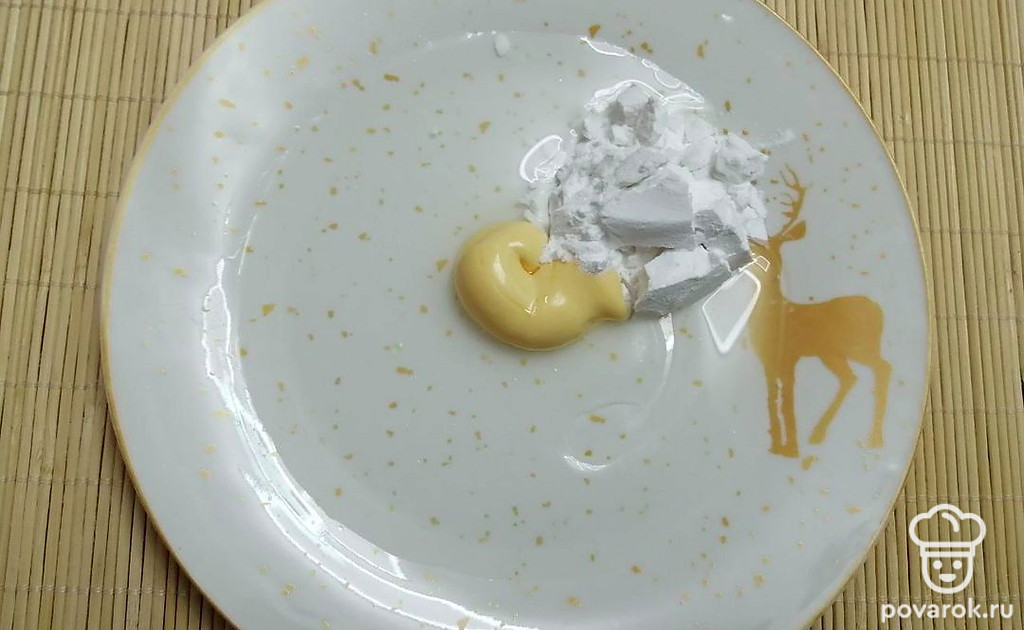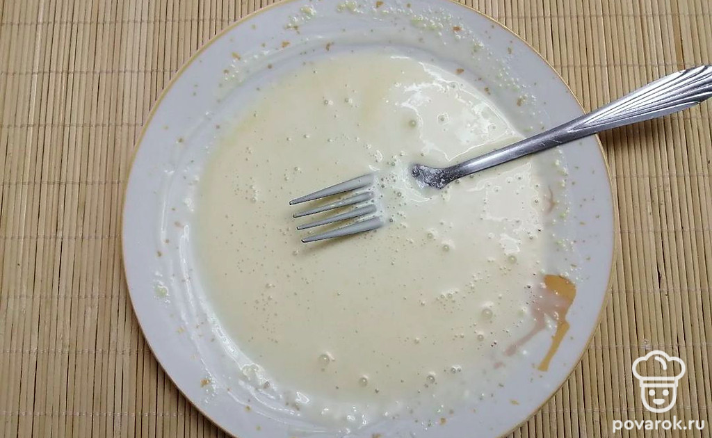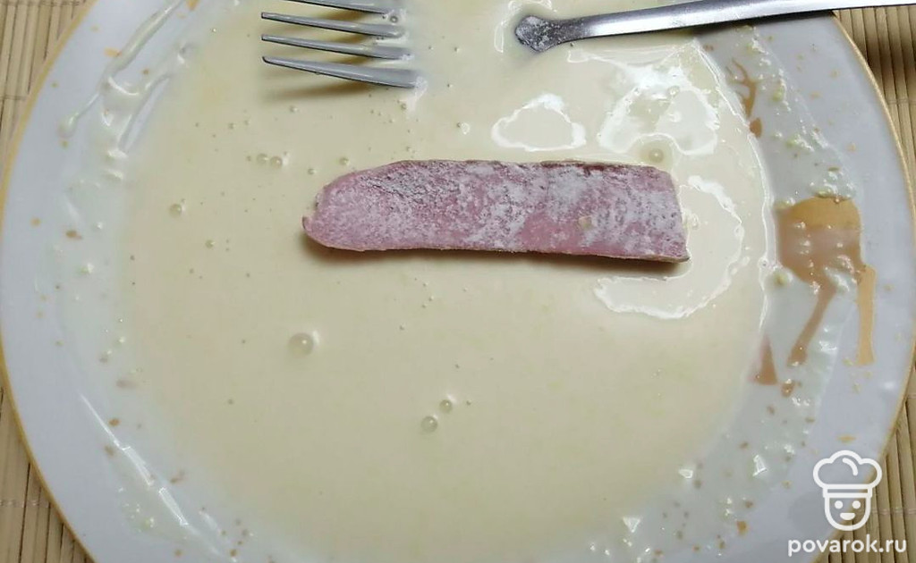 Приготовьте кляр. В выложите 2 чайных ложки сырного соуса.