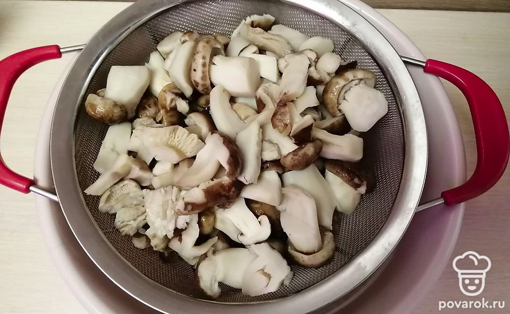 С грибов слейте воду. Откиньте на дуршлаг и еще раз промойте под проточной водой.