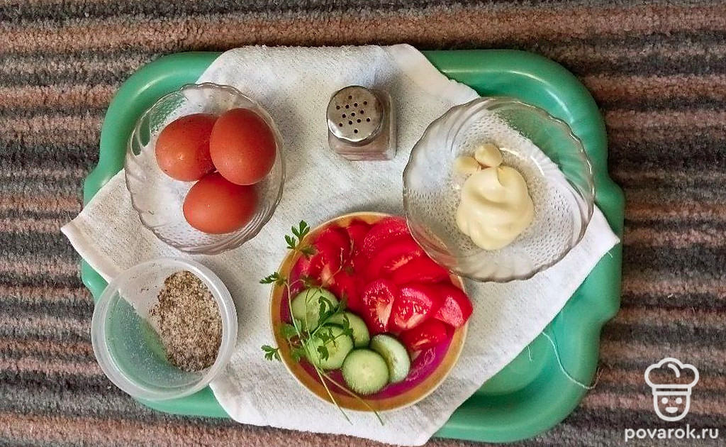 Почистите чеснок. Смешайте яйца, чеснок, майонез, перец и соль.