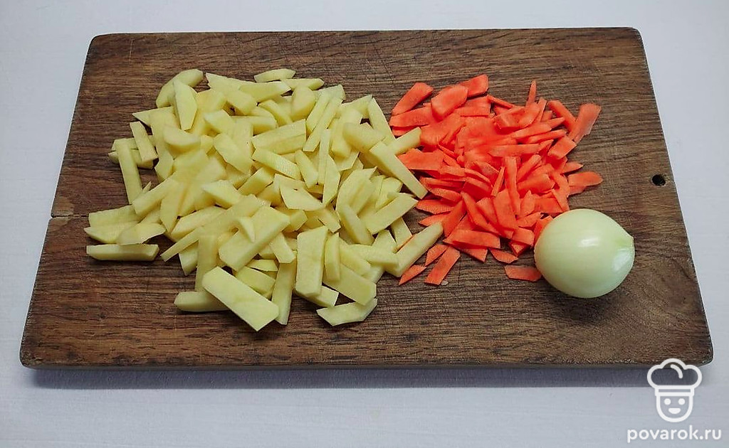 Подготовленные картофель и морковь порежьте соломкой среднего размера. Зеленый лук и щавель мелко порежьте. Предварительно замоченный рис промойте холодной водой.