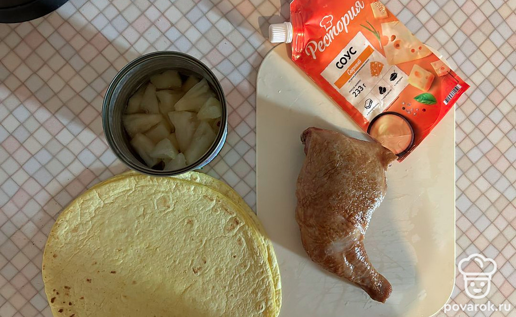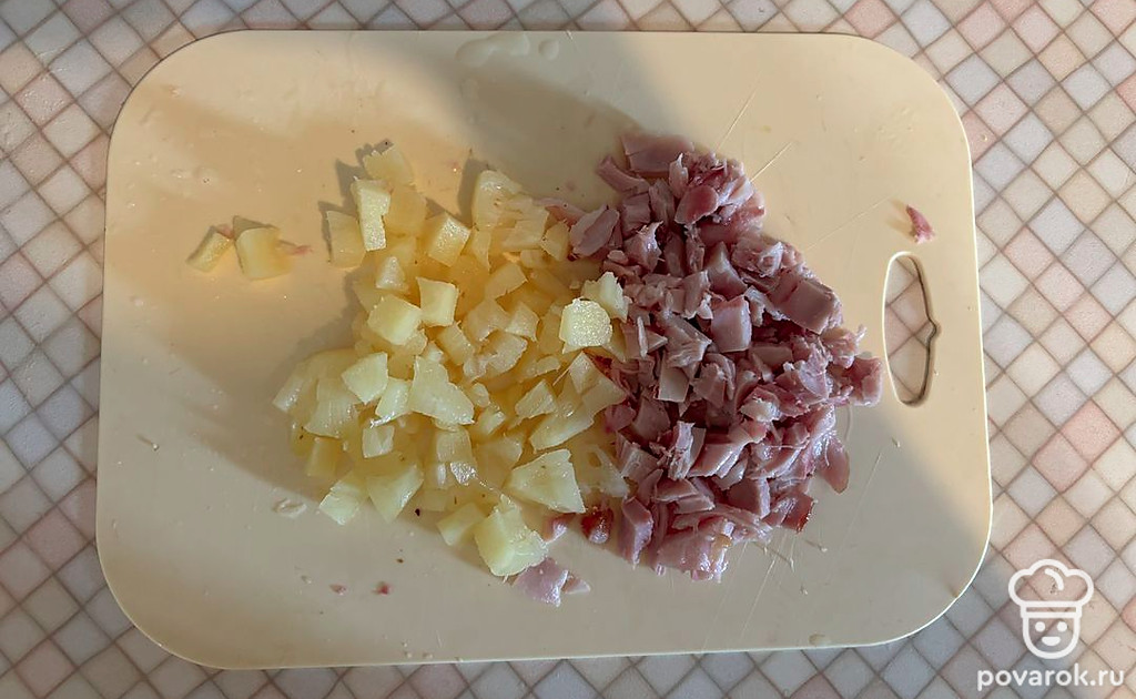 Мелким кубиком нарежьте куриное мясо и ананасы.