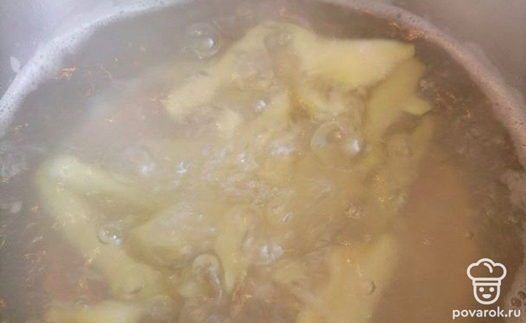 Промойте, почистите и нарежьте брусочками картофель. Опустите в кастрюлю с тремя литрами кипятка.