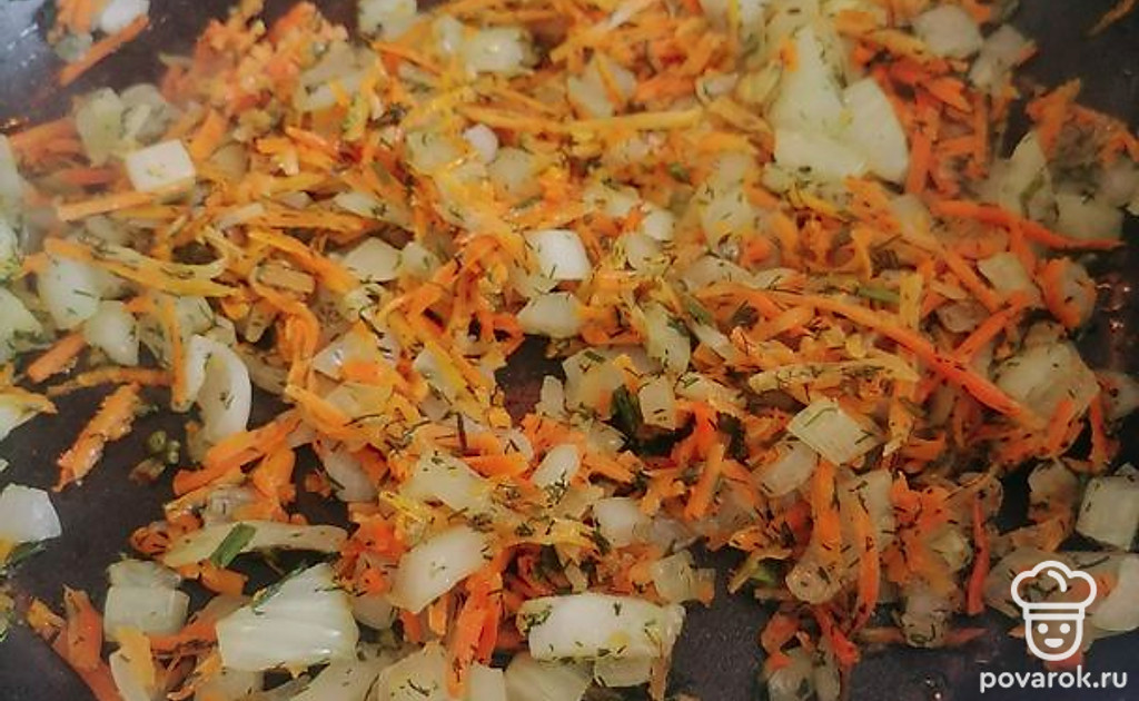 Пока картофель варится, помойте, почистите морковь и лук. Обжарьте на сковороде с растительным маслом мелко нарезанный лук, тертую морковь и порубленный укроп в течение пяти минут.