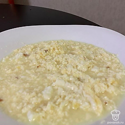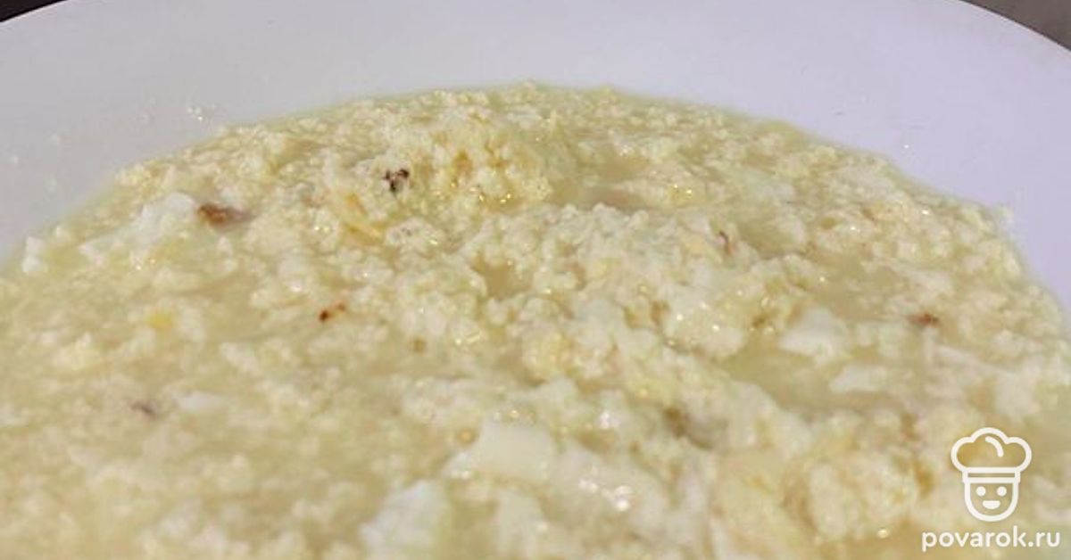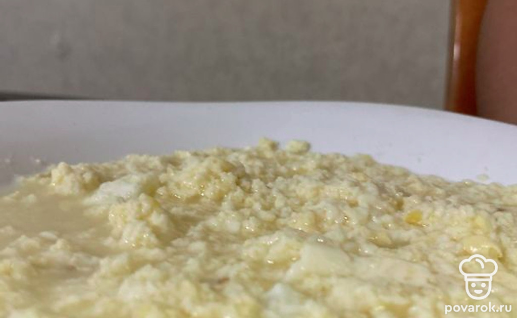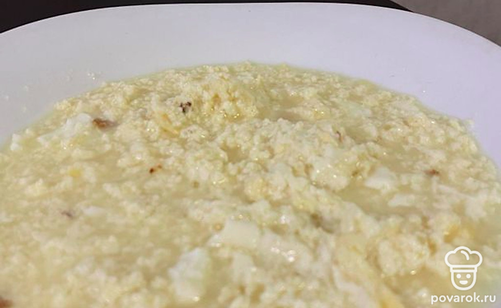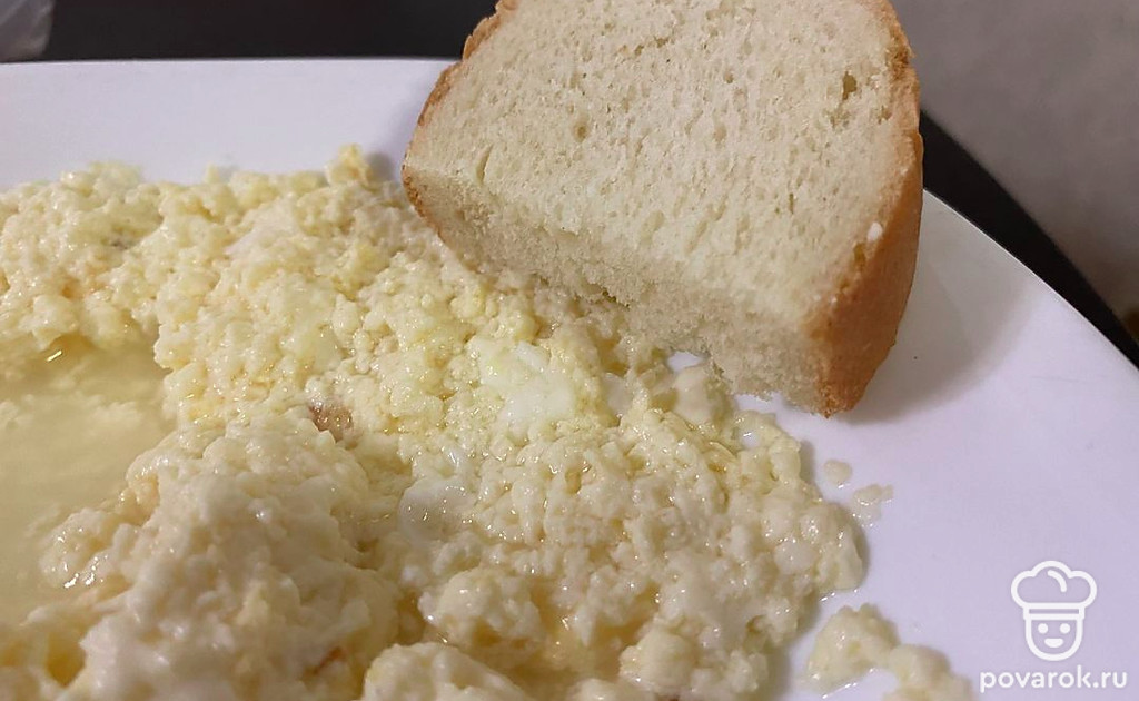 Все перемешайте, добавьте щепотку соли. Поставьте на средний огонь. Как только яйца схватятся, можно выключать. На вид будет немного похоже на омлет.