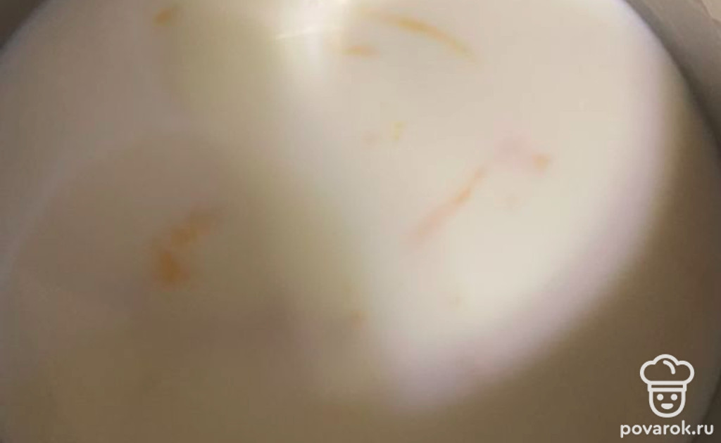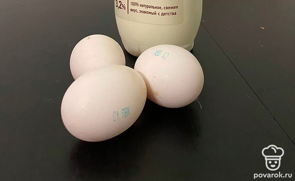 Достаньте молоко и яйца. На одну порцию достаточно одного яйца и полтора стакана молока. Помойте яйца и разбейте их в кастрюлю, добавьте молоко.